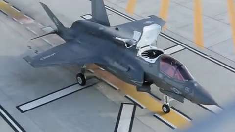 F-35B performs short takeoffs and vertical landings as part of field carrier landing practice.