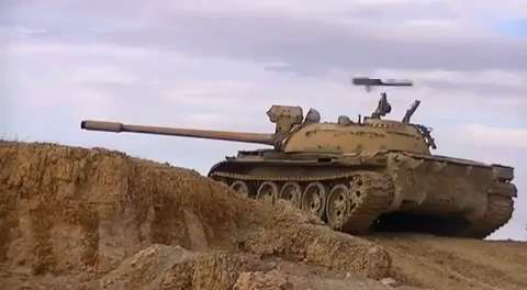 Idlib, Syria -- A T-55 tank in firing position. Cameraman leaves his camera fixated on the tank before it is