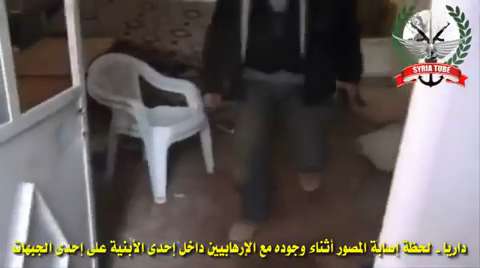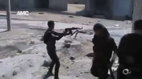 A Syrian rebel is targeted and engaged by a Syrian Army sniper while filming. 02/26/2013.